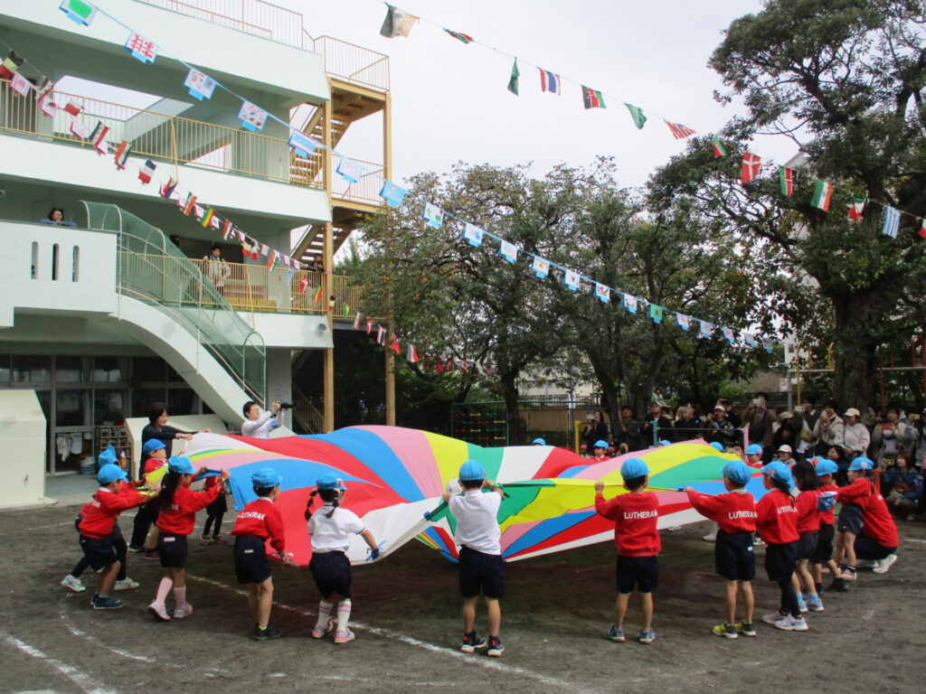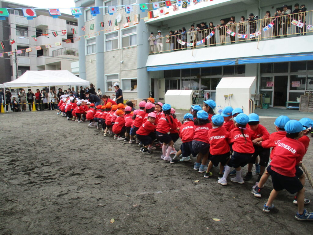 2025年10月23日 第75回 運動会 2025年10月27日 ShimizuShin 第75回運動会が始まりました。大勢の保護者の皆様が応援に駆けつけてくださいました。 つぼみ組さん・たんぽぽ組さんの「かけっこ」です。元気いっぱいゴールまで走りました。 ゆり組さんの「組み立て体操」です。オットセイのポーズがぴたりと決まりました。がんばった練習の成果ですね。 さくら組さんの「障害走」です。3つの障害を見事にクリアし、ゴールを目指すことができました。 たんぽぽ組さん・つぼみ組さんの「玉入れ」です。最後のお片付け競争までみんなにこにこ楽しんでいました。 「お助け綱引き」です。全園児が色チーム、白チームに分かれて息の合った動きで力いっぱい綱を引きました。 「さくら組リレー」「ゆり組リレー」では、応援席の保護者の皆様も力が入り、会場全体が一番の盛り上がりとなりました。 最後の競技はゆり組さんによる「パラバルーン」です。今日もいつものチームワークで次々と技が美しく決まりました。 全ての競技の終了後の「閉会式」で感謝のお祈りをしました。この後、がんばったご褒美のメダルを胸にかけ記念撮影をして楽しい運動会の一日が終わりました。みんな、練習から本番まで、本当に良く頑張りました。 Categories: 園の毎日