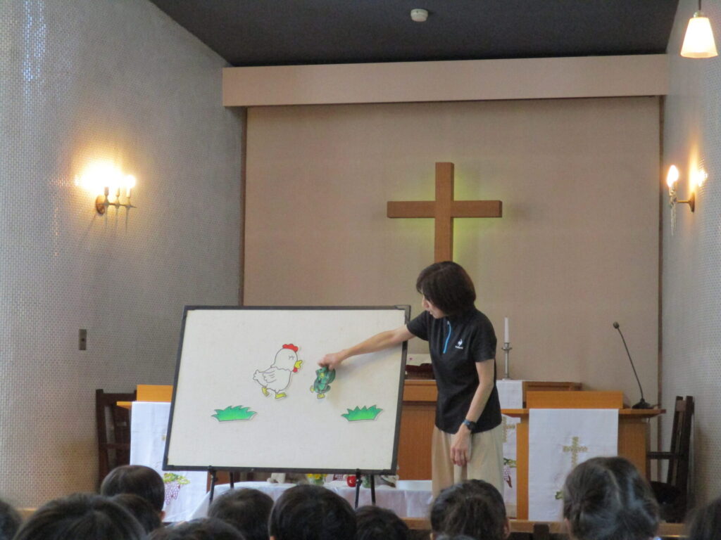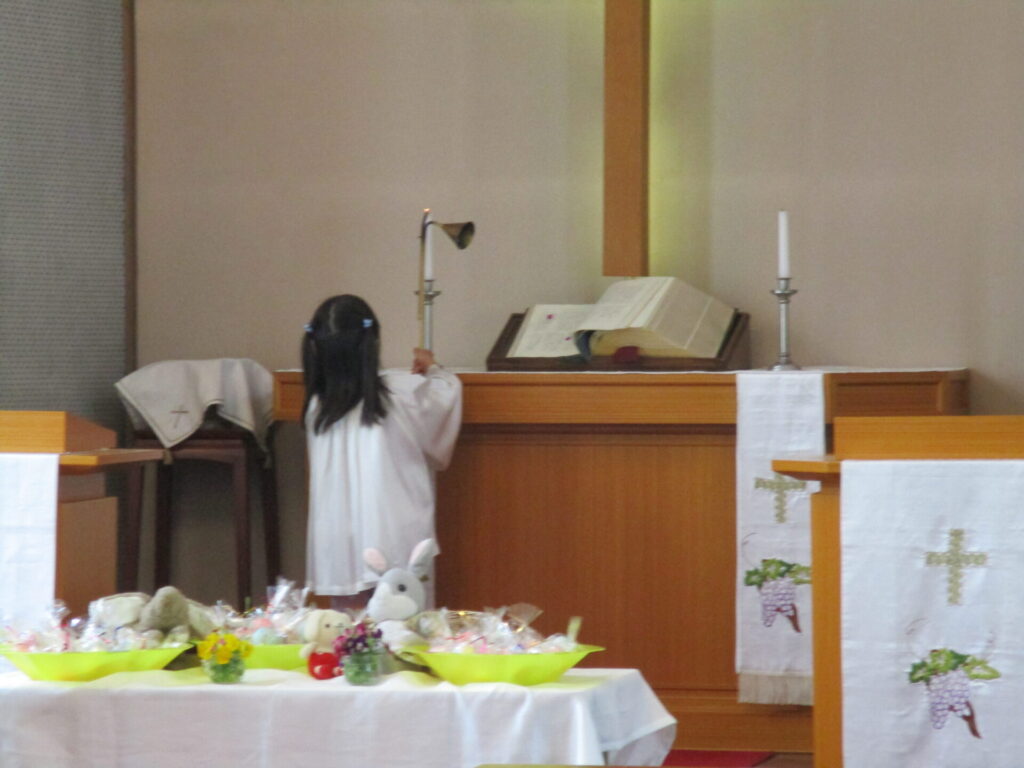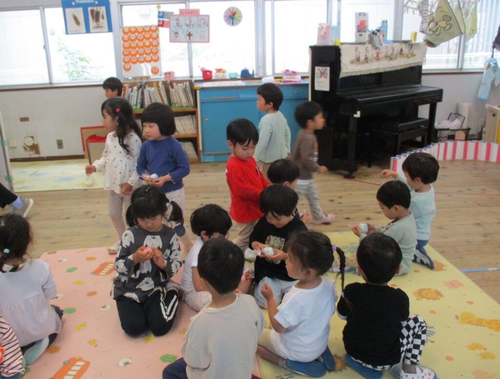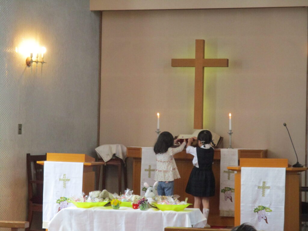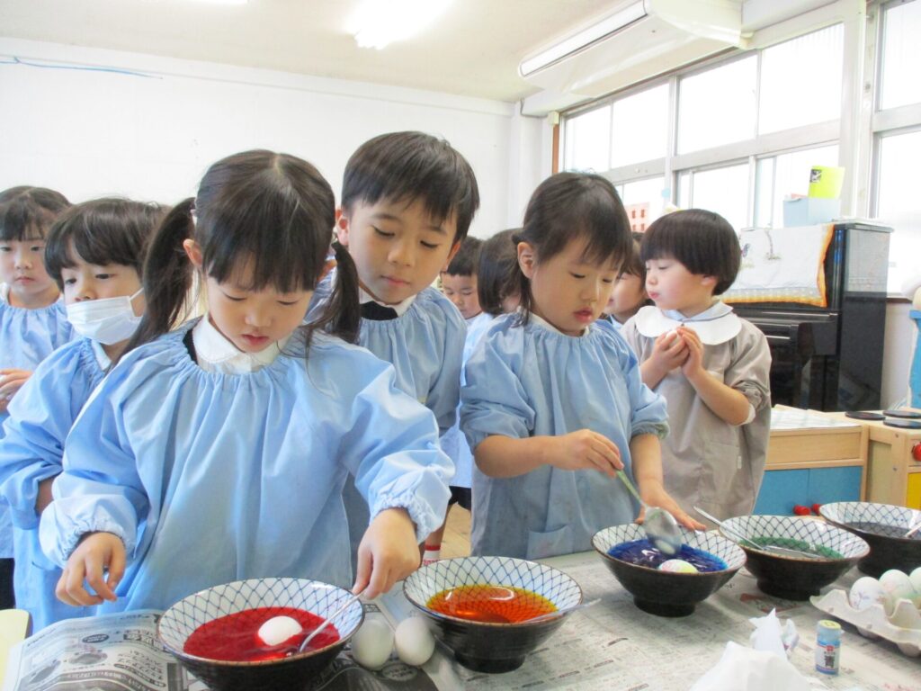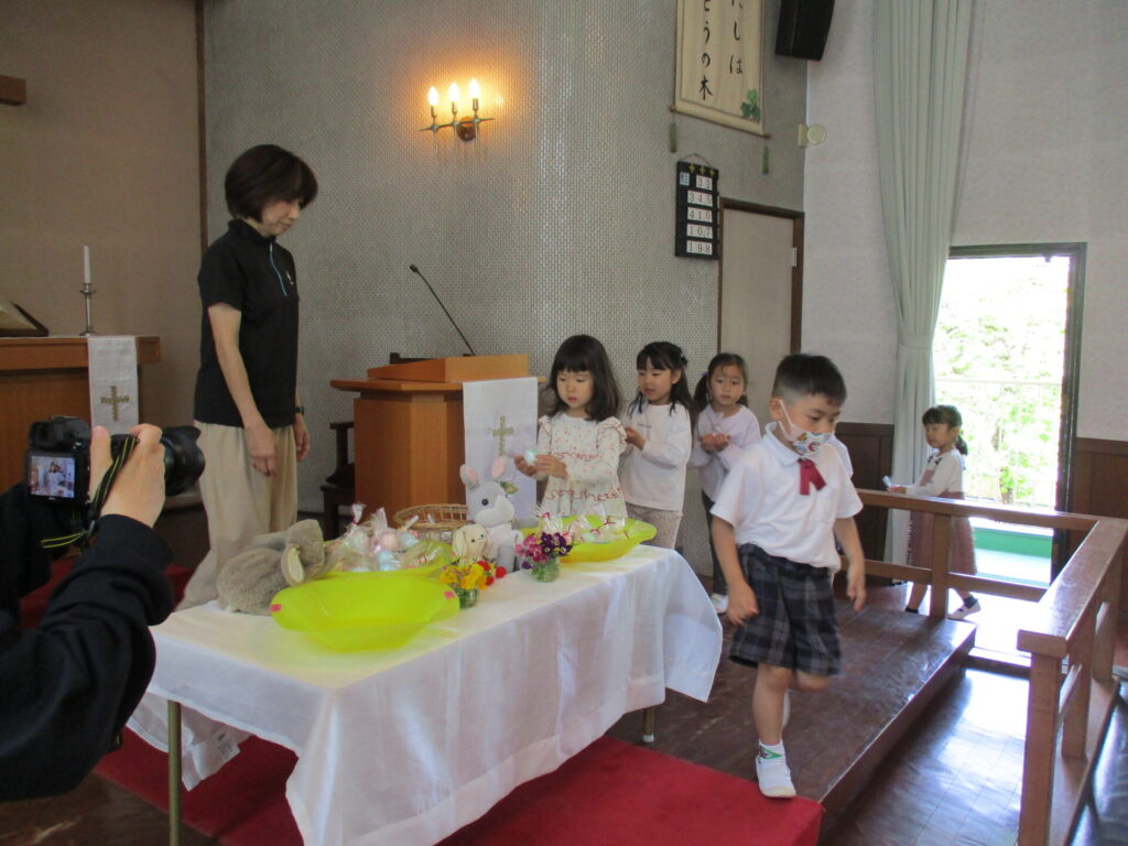 2026年4月28日 イースター礼拝 2026年4月28日 ShimizuShin イースター礼拝を前にゆり組さん、さくら組さんがイースターエッグを作りました。ゆで卵にクレヨンで思い思いの絵を描きます。 次に食紅で作った色水で丁寧に色付けをしました。明日のイースターエッグ探しも楽しみです。 今日は、昨日作ったイースターエッグをお捧げし礼拝堂の席に着きました。 ローソクに火が灯され、イースター礼拝が始まりました。 讃美歌斉唱、お祈りをし園長先生のお話を聞きます。 被災された方々を思い、皆様の心のこもったイースター献金を捧げました。 イースターエッグ探しの準備の間に「ぴよちゃんの卵」のパネルシアターを鑑賞しました。 楽しみにしていたイースターエッグ探しです。たんぽぽ組さん、見つけたすてきな卵をじっくり眺めています。 つぼみ組さんもみんな上手に見つけることが出来ました。 Categories: 園の毎日