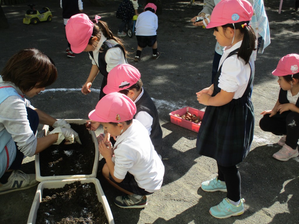 今日も穏やかなお天気、園庭のプランターにチューリップの球根を植えました。 つぼみ組のお友だち、しっかり植え方の説明を聞いています。 球根を植えたあとは、手でそっと土をかぶせました。きれいなお花が咲きますように! -