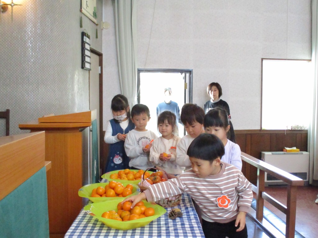 秋の実りを神さまに感謝し、収穫感謝礼拝を行いました。祭壇にみかんを捧げて礼拝の席に着きました。 ローソクに火が灯され礼拝が始まりました。 讃美歌斉唱、お祈りをして園長先生からのお話もみんな熱心に聞くことが出来ました。 ゆり組さん、さくら組さ... -