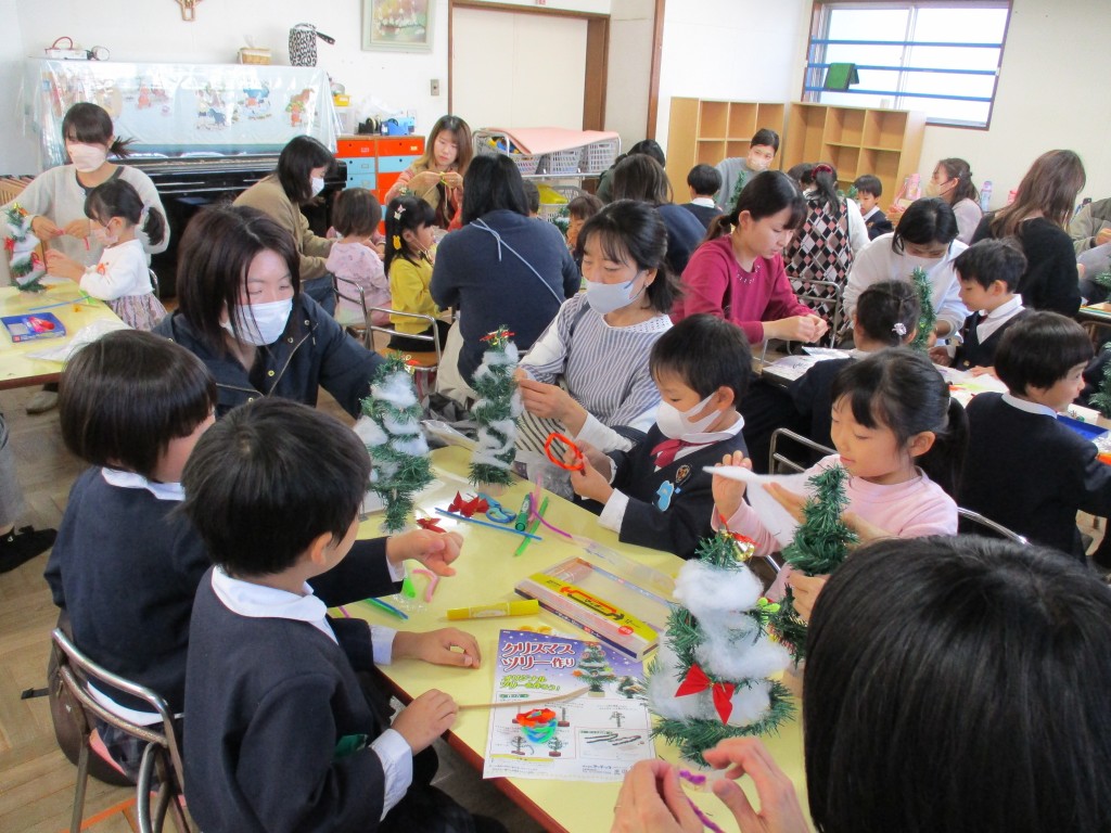 降園後、31人のお友だちがぷれいるーむに集まり、お父様お母様と合流し、親子手作り講習会が開かれました。 すてきなクリスマスツリーが出来上がりました。おうちで飾るのが楽しみですね🎄 -