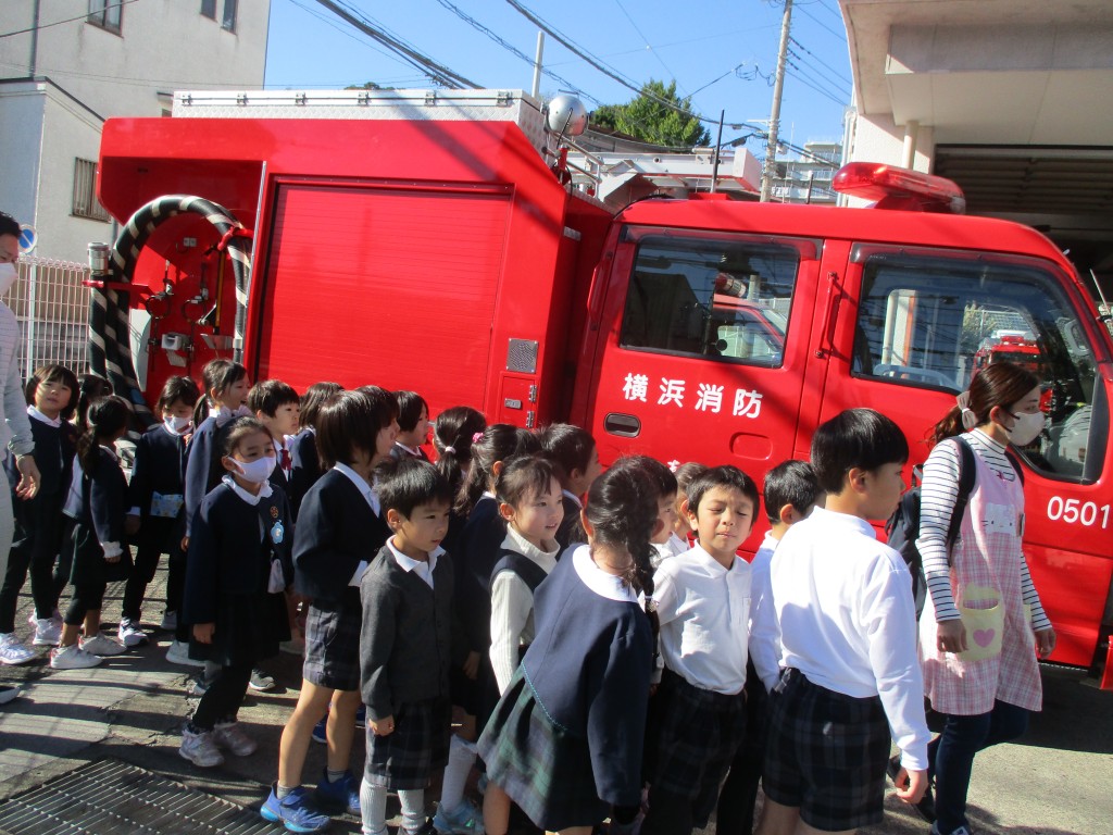 ゆり組さんが日頃の感謝の気持ちをお伝えするため、戸塚消防署を訪問しました。 消防車について細かな説明を聞いたり、防火服も着せていただいたりし、楽しいひと時を過ごすことが出来ました。 -