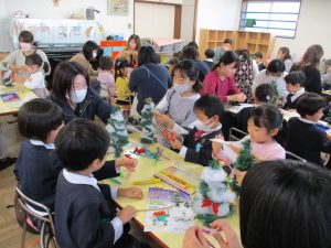 ぷれいるーむには、ゆり組さん、さくら組さんが集まって楽しい会食となりました。園長先生の姿も!!