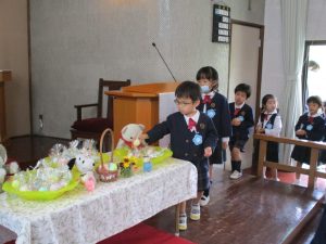 讃美歌の斉唱、お祈り、そして園長先生のお話を聞きます。新学期を迎え約1ヶ月、落ち着いて礼拝を守ることができています。