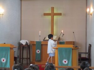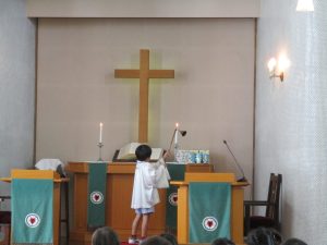 年長ゆり組さん、午後から再登園し、「お泊まり会」開会礼拝が始まりました。