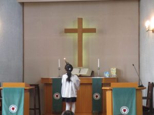 お店屋さんごっこの当日を迎えました。まずは全園児が礼拝堂に集まり、各クラスのお店紹介がありました。ゆり組のお店は「ラーメンやさん」「さかなやさん」「ほんやさん」です。
