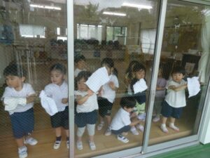 年長ゆり組さん、14時半に再登園し、待ちに待った「デイキャンプ」開会礼拝が始まりました。