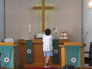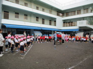 ゆり組さん、さくら組さんが舞岡のふるさと村までお芋ほりに出かけました。いつものようにお祈りをして出発です。