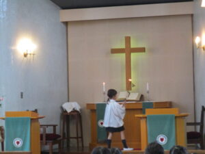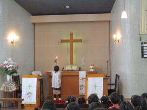 ページェントごっこのコーナーでは、小さいクラスのお友だちもゆり組さんのお友だちに動きや歌を教わりながら、楽しんでいる様子が見られました。