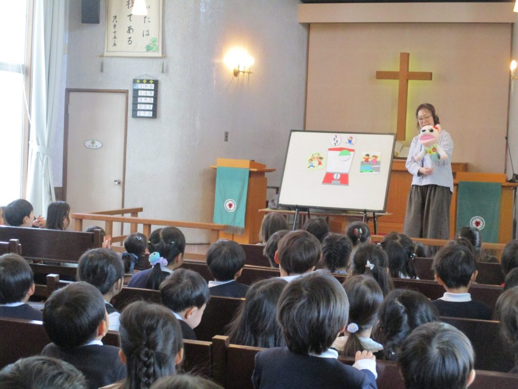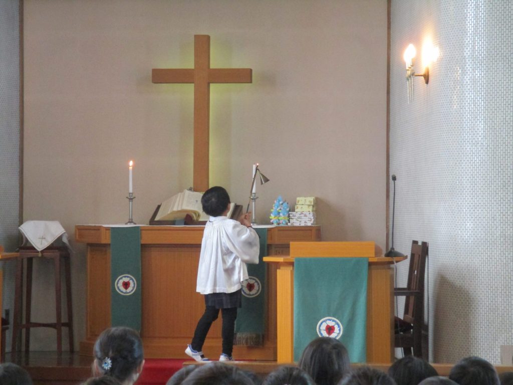 ローソクに火が灯され、10月生まれのお誕生会礼拝が始まりました。 讃美歌斉唱、お… -