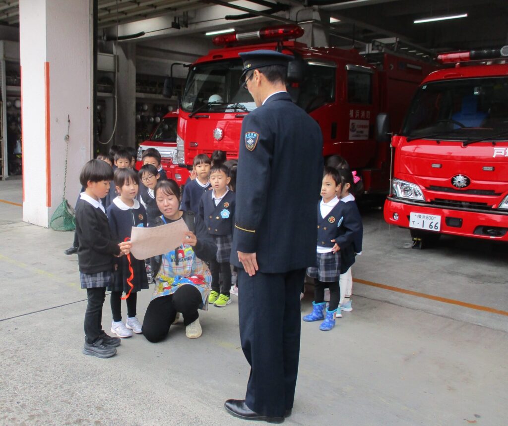 2025年11月25日 勤労感謝訪問 2025年11月25日 ShimizuShin 今日は、日頃お世話になっている方々へ感謝の気持ちをお伝えするため、勤労感謝訪問をしました。たんぽぽ組さん・つぼみ組さんは社会福祉協議会「フレンズ戸塚」を訪問しました。 代表のお友だちから感謝状を贈らせていただきました。 さくら組さんは、「戸塚西口交番」を訪問しました。ひとりずつ順番にパトカーの運転席にのせていただきました。みんなとっても嬉しそうでした。 交番のみなさんにお仕事の様子をお話いただき、質問にも答えていただきました。最後に代表のお友だちから感謝状を贈りました。 ゆり組さんは、「戸塚消防署」を訪問しました。防火服を着る体験もし、カメラマンさんに記念撮影をしていただきました。 はしご車のはしごを最大限38メートルまで伸ばす様子を見せていただき、みんな目を輝かせて見学しました。 消防車を間近で見学、いろいろなお話を聞かせてくださいました。消防車をバックに記念撮影、ポーズも決まりました。 最後に感謝状をお贈りし、改めて日頃の感謝の気持ちをお伝えしました。訪問先の皆様、お忙しい中、ありがとうございました。 Categories: 園の毎日