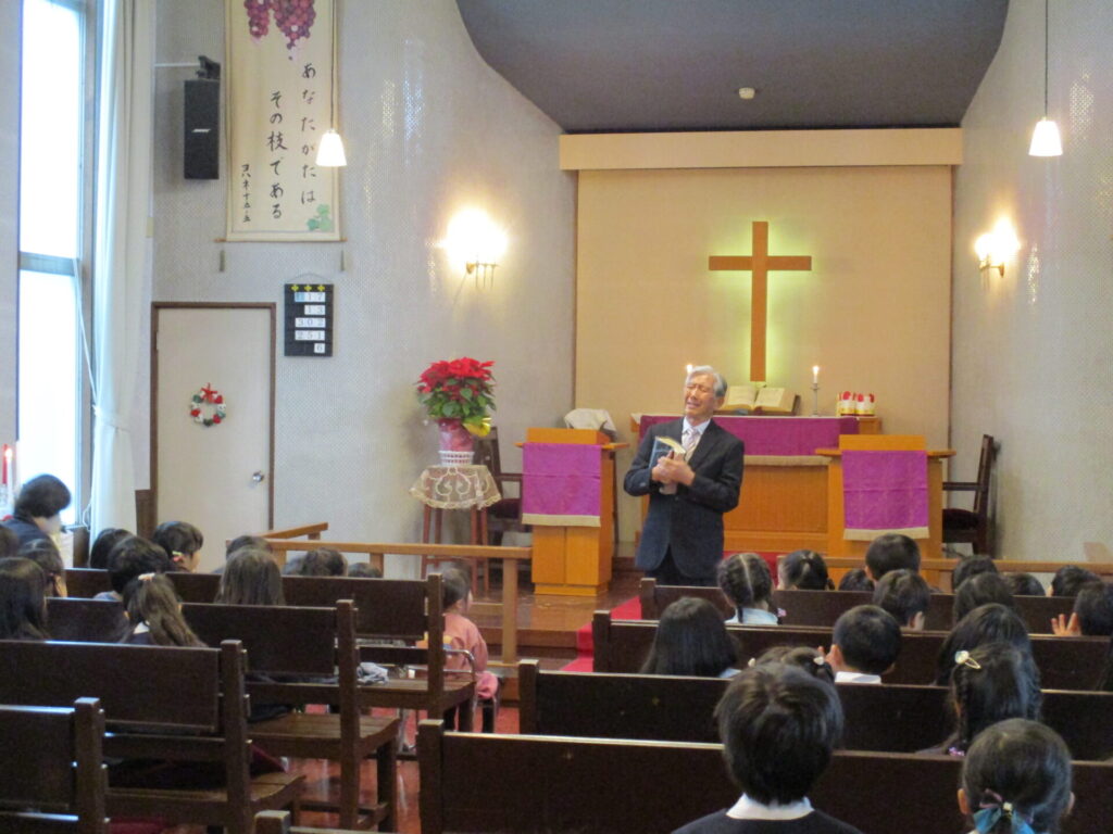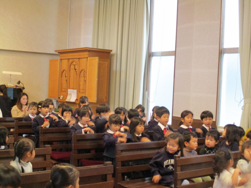讃美歌斉唱、お祈り、そして園長先生のお話を聞きます。