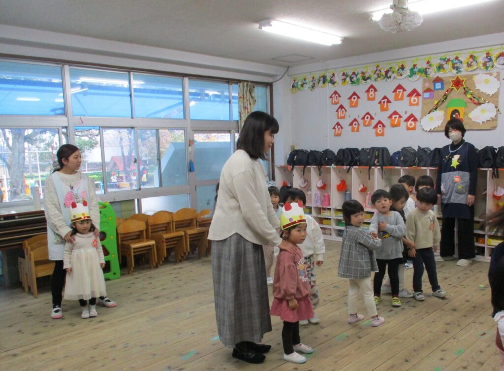 お誕生者がクラスごとに紹介され、園長先生からプレゼントをいただき、祝福を受けます。