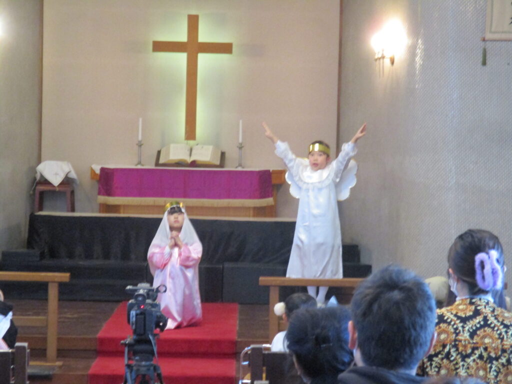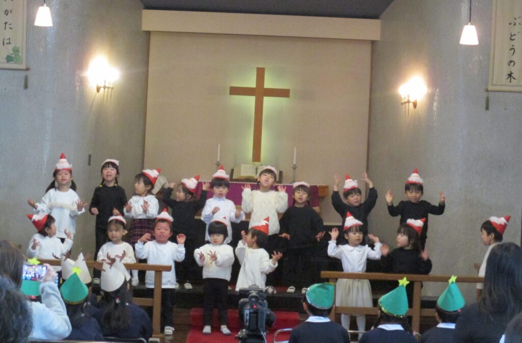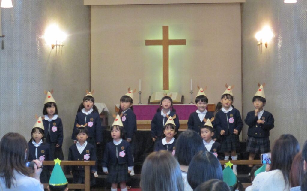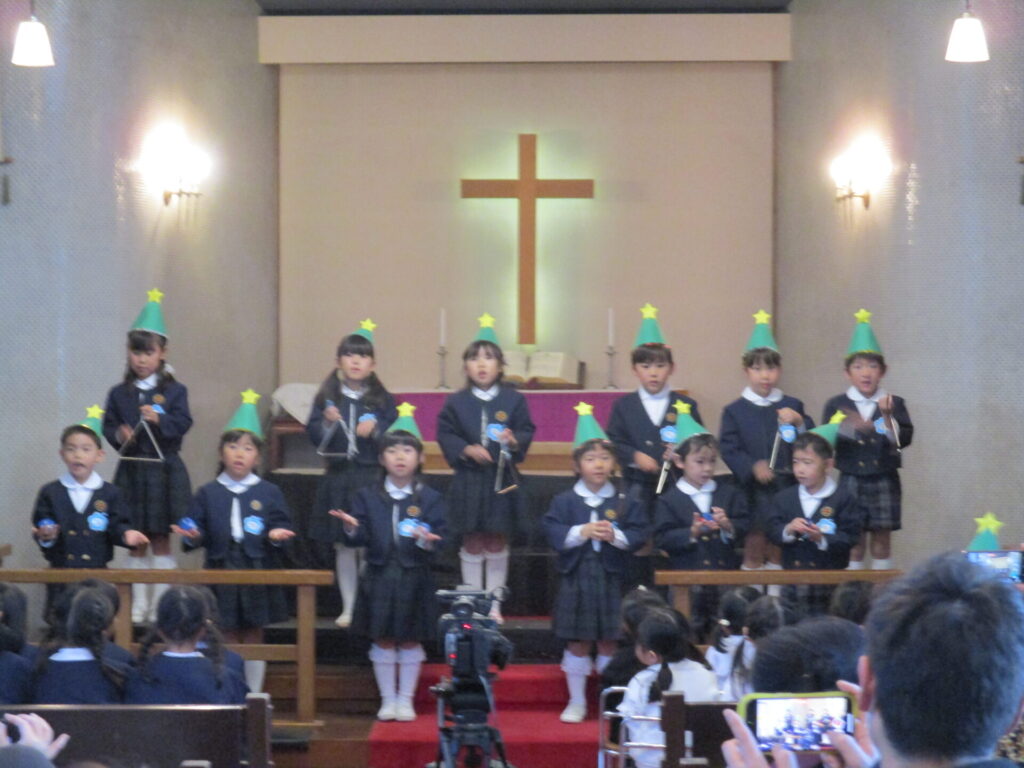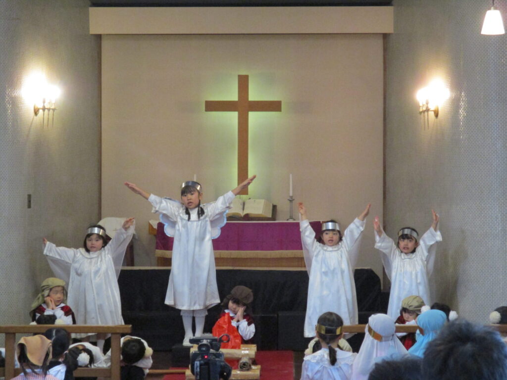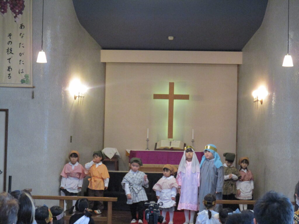 2025年12月11日・12日 クリスマスページェント礼拝 2025年12月19日 ShimizuShin 今年も保護者の皆様をお招きし、ページェント礼拝が守られました。ナレーターさん「ひとりのみどりごがわたしたちにあたえられた」 天の使いガブリエルとマリアさんです。「ガブリエルがきてふしぎなことをしらせました。」 ローマ兵の登場です。「ローーマのおうさまはじんこうちょうさのめいれいをだしました。」 ヨセフさんとマリアさんはベツレヘムにつきました。「いいやどやがあるといいわね。」 ベツレヘムののはらの羊と羊飼いです。「そのよる、ふしぎなことがおこりました。」 天使さんです。「きょうベツレヘムのうまごやで、すくいぬしがおうまれになりました。」 星たちです。「イエスさまがおうまれになったとき、ふしぎにひかるほしがかがやいていました。」 遠い東の国の星を研究する博士です。「あれはすくいぬしがおうまれになったしるしのほしだ。」 最後の場面です。「もろびとこぞりて♪」を歌ってクリスマスをお祝いしました。二日間にわたるページェント礼拝、全園児がひとつになり素晴らしい礼拝を守ることができました。 お楽しみの二部は、クラスごとの発表です。」たんぽぽ組さん、つぼみ組さん「あわてんぼうのサンタクロース」振り付けも上手にできました。 さくら組さんの「ジングルベル」の合唱と合奏です。明るく楽しく発表できました。 ゆり組さんの「おめでとうクリスマス」の合唱と合奏、さすがゆり組さん、クラスのまとまりも感じられる発表でした。 Categories: 園の毎日