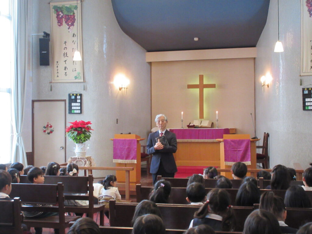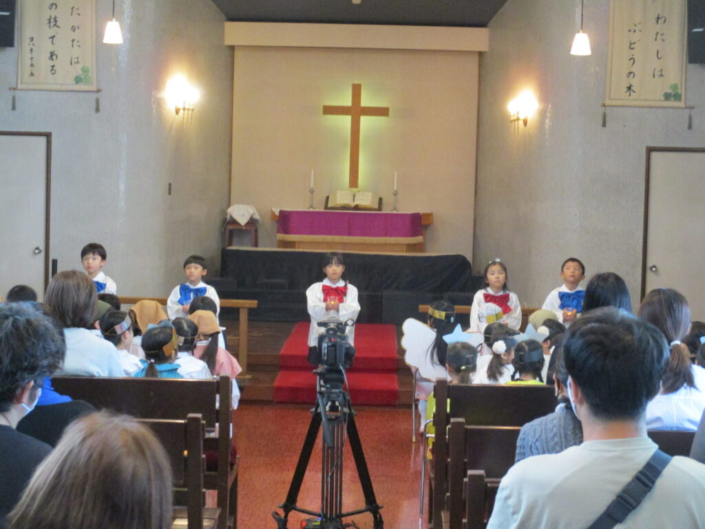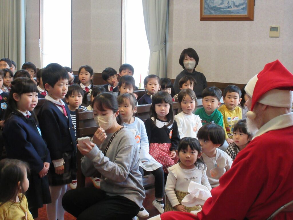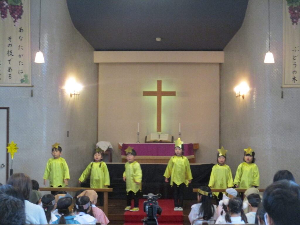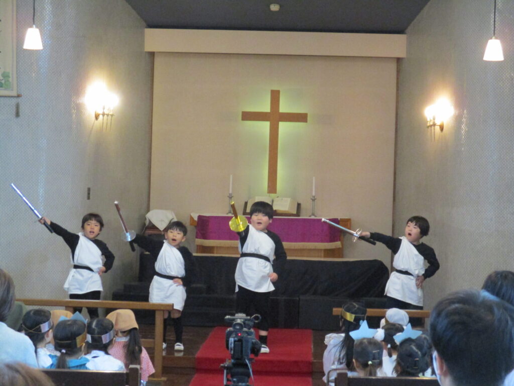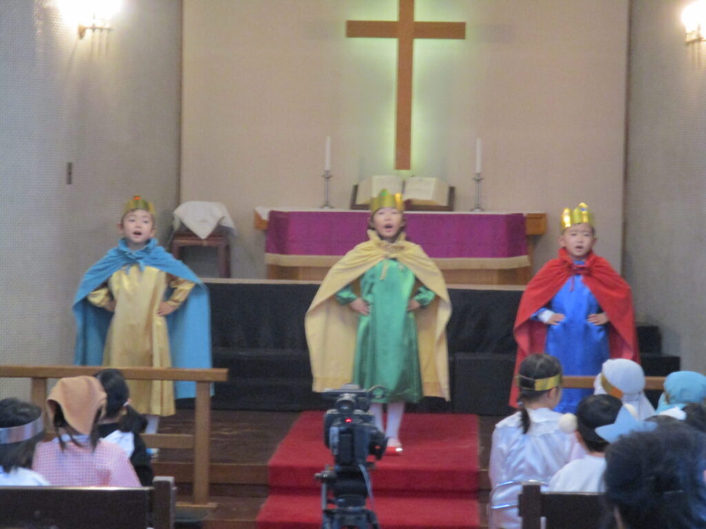 2025年12月11日・12日 クリスマスページェント礼拝 2025年12月19日 ShimizuShin 今年も保護者の皆様をお招きし、ページェント礼拝が守られました。ナレーターさん「ひとりのみどりごがわたしたちにあたえられた」 天の使いガブリエルとマリアさんです。「ガブリエルがきてふしぎなことをしらせました。」 ローマ兵の登場です。「ローーマのおうさまはじんこうちょうさのめいれいをだしました。」 ヨセフさんとマリアさんはベツレヘムにつきました。「いいやどやがあるといいわね。」 ベツレヘムののはらの羊と羊飼いです。「そのよる、ふしぎなことがおこりました。」 天使さんです。「きょうベツレヘムのうまごやで、すくいぬしがおうまれになりました。」 星たちです。「イエスさまがおうまれになったとき、ふしぎにひかるほしがかがやいていました。」 遠い東の国の星を研究する博士です。「あれはすくいぬしがおうまれになったしるしのほしだ。」 最後の場面です。「もろびとこぞりて♪」を歌ってクリスマスをお祝いしました。二日間にわたるページェント礼拝、全園児がひとつになり素晴らしい礼拝を守ることができました。 お楽しみの二部は、クラスごとの発表です。」たんぽぽ組さん、つぼみ組さん「あわてんぼうのサンタクロース」振り付けも上手にできました。 さくら組さんの「ジングルベル」の合唱と合奏です。明るく楽しく発表できました。 ゆり組さんの「おめでとうクリスマス」の合唱と合奏、さすがゆり組さん、クラスのまとまりも感じられる発表でした。 Categories: 園の毎日