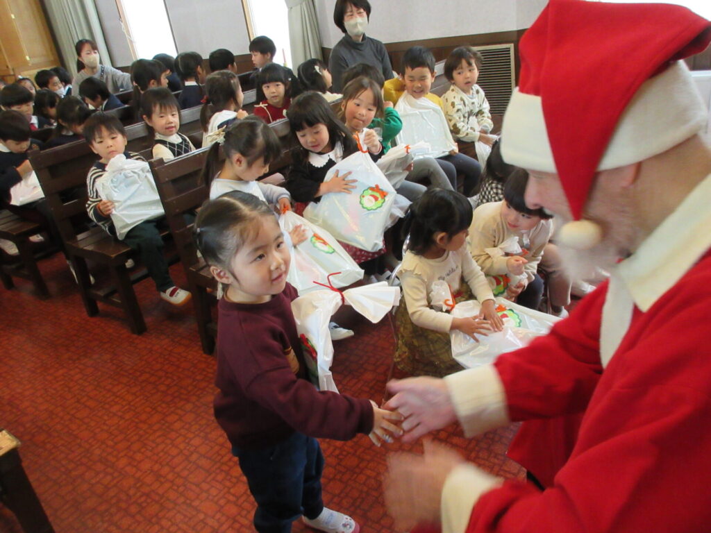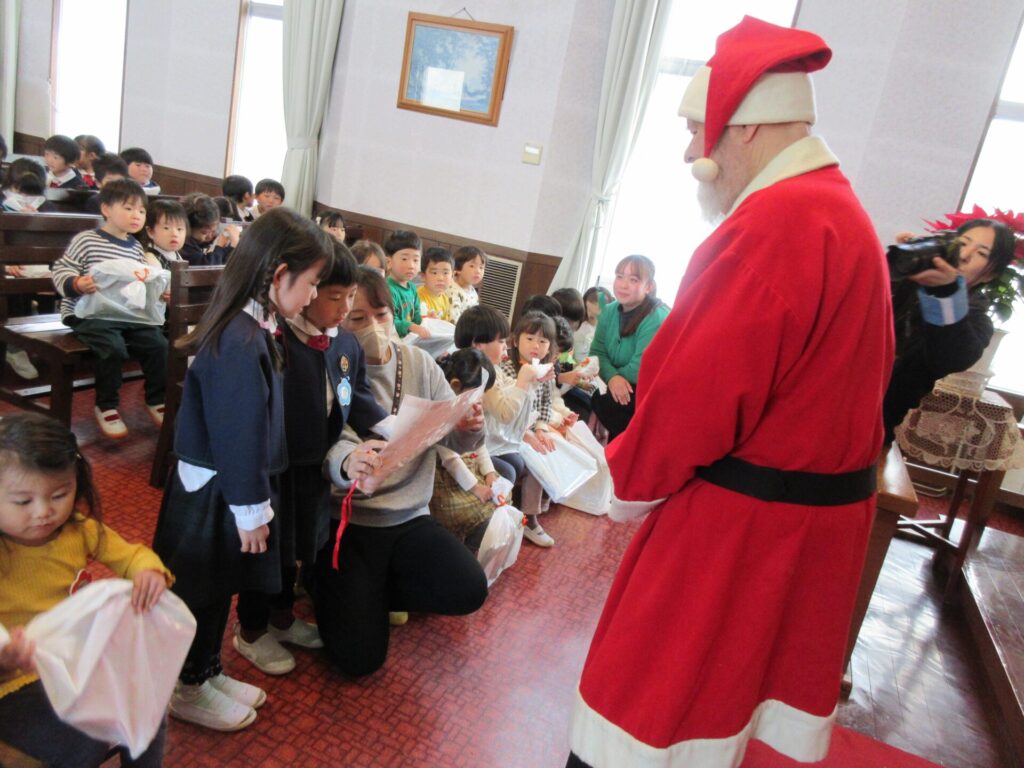2025年12月17日 クリスマス礼拝・祝会 2025年12月19日 ShimizuShin もうすぐクリスマス🎄アドベントクランツにも3本のローソクに火が灯され、クリスマス礼拝が始まりました。 いつものように讃美歌斉唱、心静かにお祈りをし、園長先生のお話を聞きます。 礼拝の後の祝会です。「サンタ迎え歌」を元気いっぱいに歌ったお友だち。ですが、実際にサンタさんが現れるとみんなびっくり!一瞬礼拝堂が静まり返ってしまいました。サンタさん!いらしてくださってありがとうございます。ゆり組さんの送った手紙が届いたようですね♡ クリスマスのお話を聞いたり、質問をさせていただいたり、サンタさんと一緒に素敵な時間を過ごすことができました。 そして…ひとひひとりにプレゼントを渡してくださいました。しっかり握手もできました。みんなの笑顔も素敵でした。 ゆり組さんの代表のお友だちから感謝状を贈らせていただきました。サンタさん!必ず!来年もいらしてくださいね🎅 Categories: 園の毎日