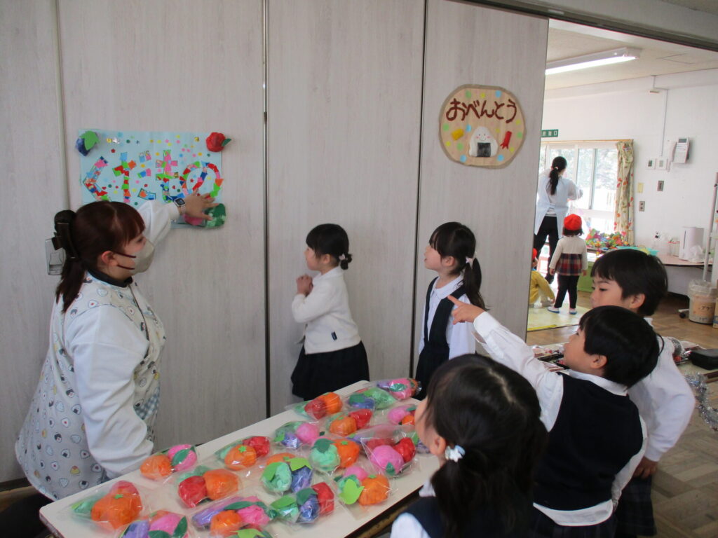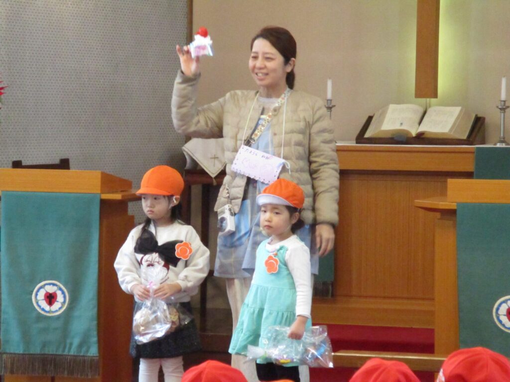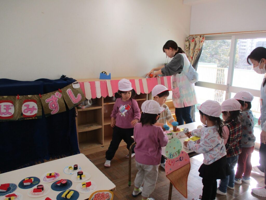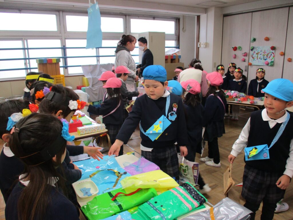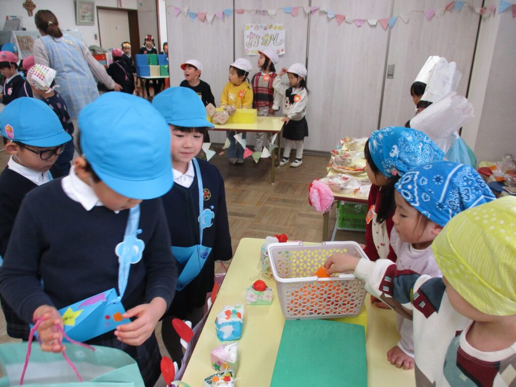 2026年1月21日 お店屋さんごっこ 2026年1月23日 ShimizuShin お友だちみんなが楽しみにしている「お店屋さんごっこ」がいよいよ明日となりました。 こちらはゆり組さんの「るーてるぎんこう」です。お店屋さんごっこで使うお金をもらいます。おさいふはもちろん手作りです。 つぼみ組さん、「あいすくりーむやさん」と「おすしやさん」の準備をしています。 さくら組さんは「くだものやさん」「おべんとうやさん」「くれーぷやさん」の準備で品物並べやお店の看板や飾りつけをみんなで相談して進めました。 いよいよ「お店屋さんごっこ」当日です。全園児が礼拝堂に集まりクラスごとにお店の紹介をしました。ゆり組さんのお店は「ようふくやさん」「ほんやさん」「ぶんぼうぐやさん」の3店舗です。 たんぽぽ組さんのお店は「ぱんやさん」「おかしやさん」「けーきやさん」です。おいしそうな品物は、先日の保育参加日におうちの方と一緒に作ったものです。 「いらっしゃいませ~」と、どのお店もにぎやか、買い物をするお友だちは真剣に商品を選んでいました。 どのお店も大盛況、お買い物はもちろん店員さんとしてももみんなが楽しく参加でき、あっという間に商品は完売してしまいました。 Categories: 園の毎日