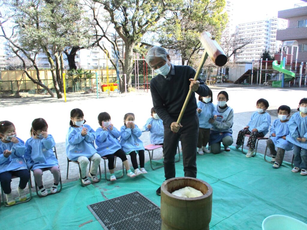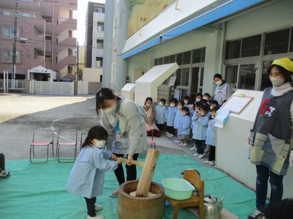 2026年1月27日 お餅つき 2026年1月30日 ShimizuShin 今日はお餅つきを行いました。前日には、ゆり組さんのお友だちがもち米をといで準備を始めました。 ひと晩水につけたもち米を蒸し、いよいよお餅つきです。 「ぺったんぺったんお餅つき!」の掛け声に合わせてクラスごとに順番にお餅をつきました。つぼみ組さんはたんぽぽ組さんにも応援してもらいました。 仕上げは園長先生。おいしそうなお餅がつきあがりました。 Categories: 園の毎日