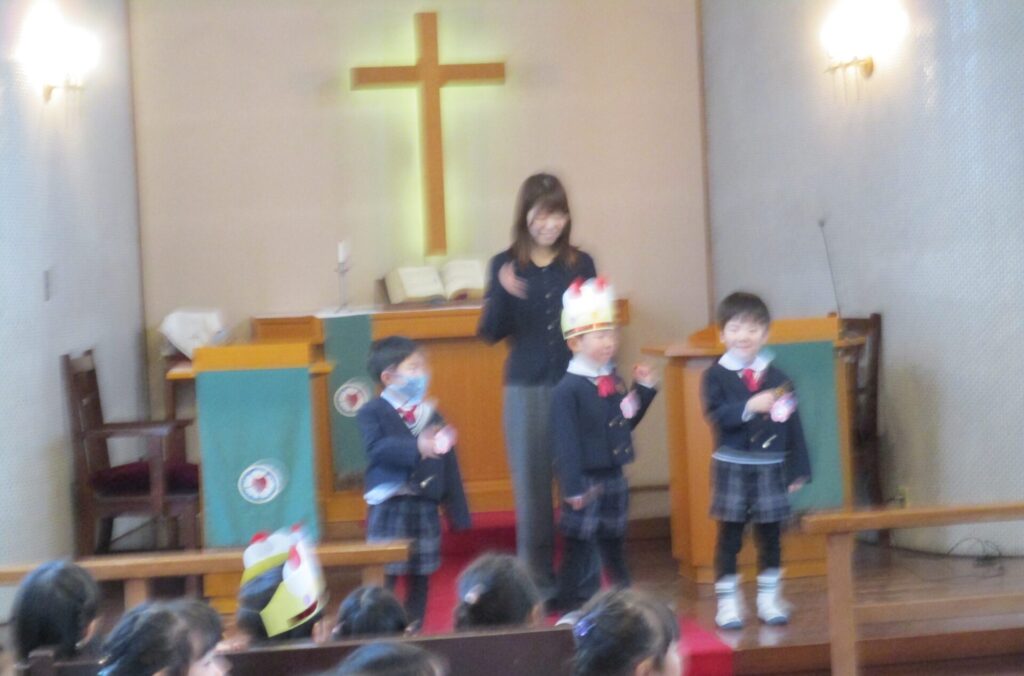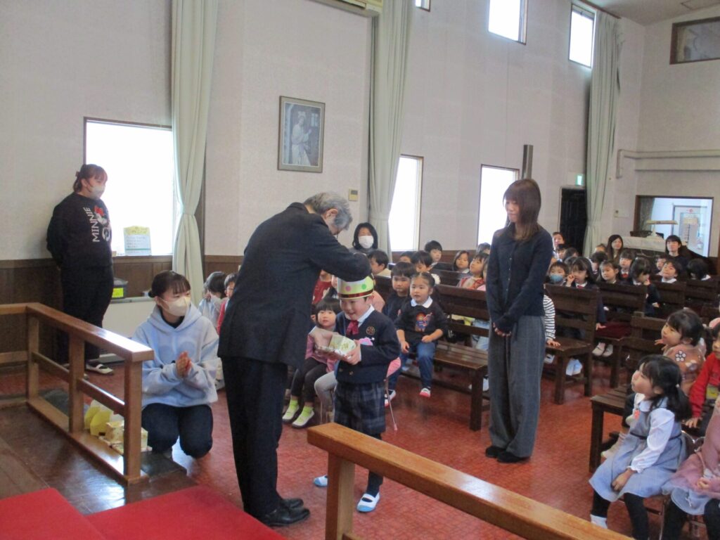 2026年1月28日 お誕生会 2026年1月30日 ShimizuShin ローソクに火が灯され、1月生まれのお誕生会礼拝が始まりました。 讃美歌斉唱、お祈りの後、園長先生のお話を聞きます。 お誕生者がクラスごとに紹介され、園長先生よりプレゼントをいただき、祝福を受けます。 さくら組さんお誕生者からの感謝の発表は、「雪のペンキ屋さん」です♪ たんぽぽ組お誕生者の感謝の出し物は「森のくまさん」です♪ 今月のお祝いの出し物は先生たちによる影絵「ねずみのすもう」です。 礼拝堂での記念撮影の後はクラスに分かれてお祝いの時を持ちました。 たんぽぽ組さんでは、お誕生月仲間を楽しみました。 Categories: 園の毎日