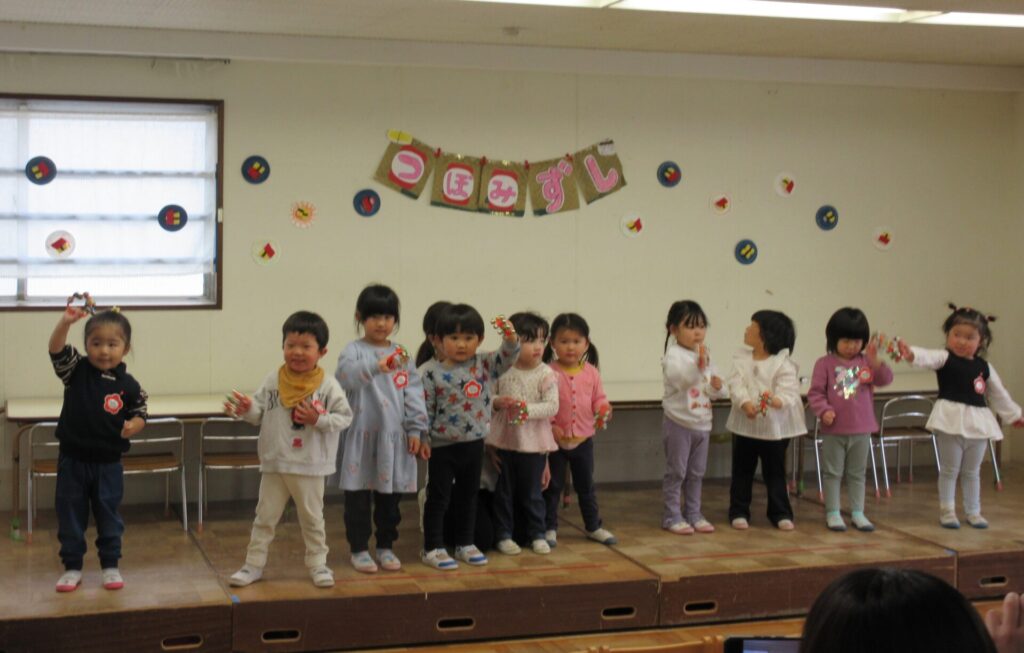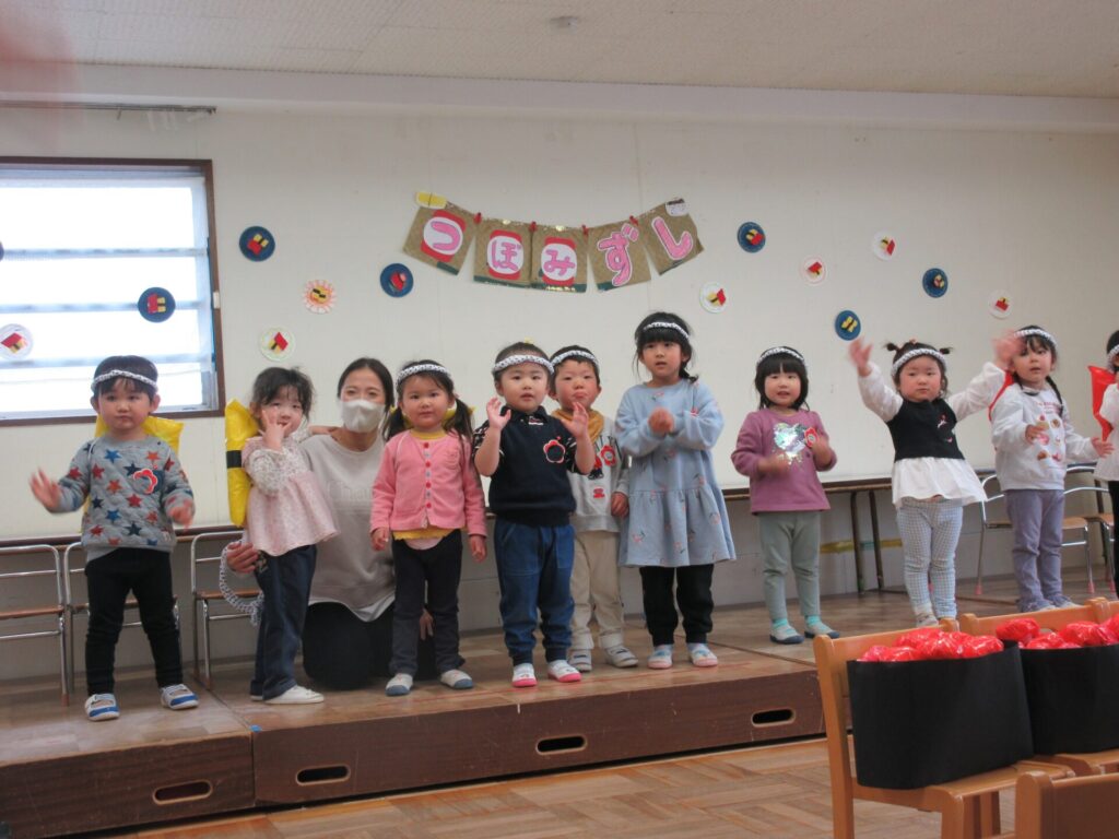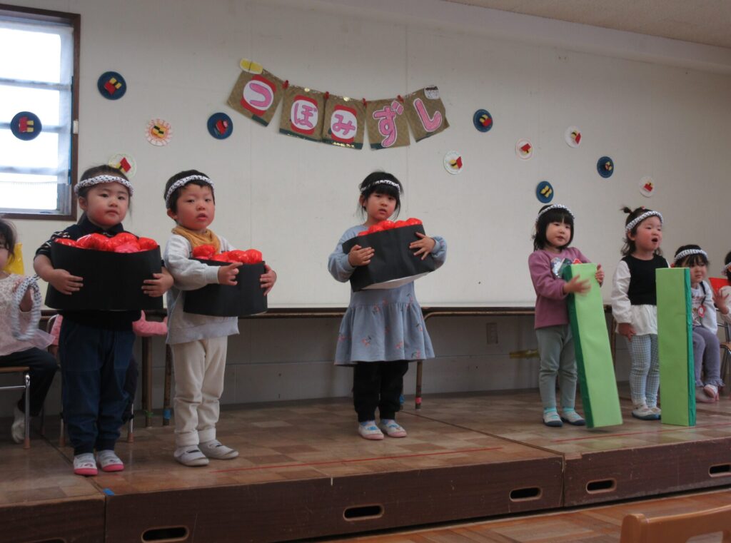 2026年3月13日 つぼみ組発表会 2026年3月13日 ShimizuShin 保護者の方をお招きし、つぼみ組の発表会がありました。最初に「おもちゃのチャチャチャ」の歌と合奏です。 次にミニミニ劇、「つぼみずし」です。練習通りに楽しく発表できました。 最後にみんなで「おすしのピクニック」のダンスを踊りました。かわいらしく元気に1年間の成長を見せてくれました。 Categories: 園の毎日