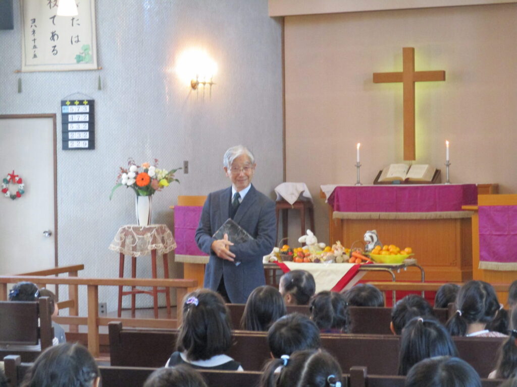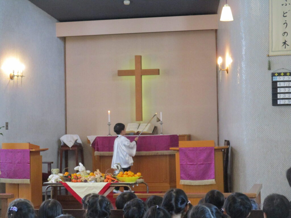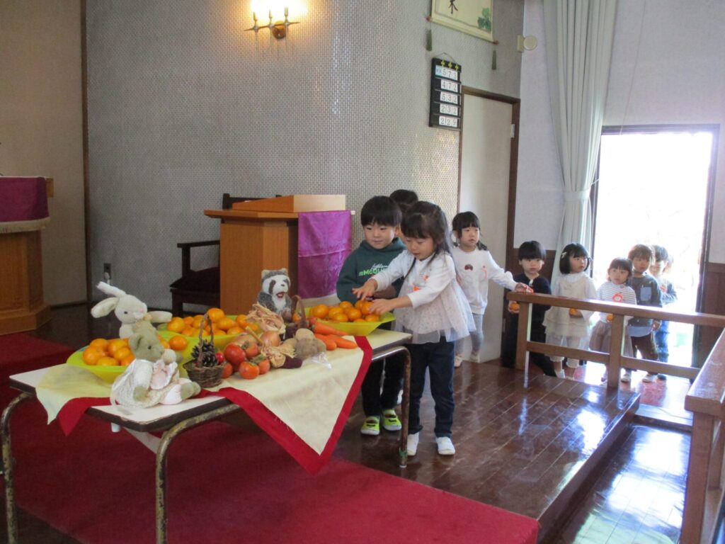 2025年11月26日 収穫感謝礼拝 2025年11月28日 ShimizuShin 収穫感謝礼拝です。みかんを祭壇にお捧げし、礼拝堂に入場しました。 ローソクに火が灯され、収穫感謝礼拝が始まりました。祭壇には幼稚園で収穫した柿や、みんなが持ち寄った野菜も捧げられました。 讃美歌斉唱、お祈り、そして今日も園長先生からお話を聞き、神さまに感謝の気持ちを持つことができました。 Categories: 園の毎日